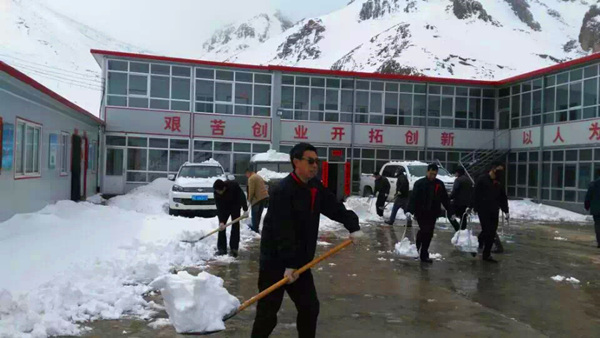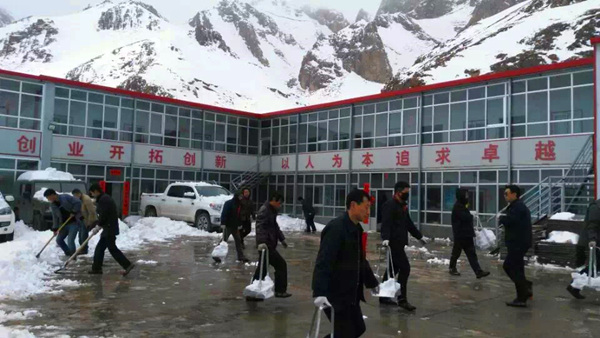 2016年3月21日青海共和縣青海銅鑫礦業(yè)有限公司礦區(qū)迎來了自春節(jié)以來的第一場大雪,前幾這里還太陽高照,天氣晴朗,與此同時(shí)洛陽陽光明媚,鳥語花香,現(xiàn)在青海銅鑫礦區(qū)則被厚厚的白雪覆蓋,呈現(xiàn)出另一番別樣的景像。青海分公司員工也一起參加礦山工作區(qū)的除雪工作,個個干得熱火朝天,一會兒大院里的雪就被清理完畢。