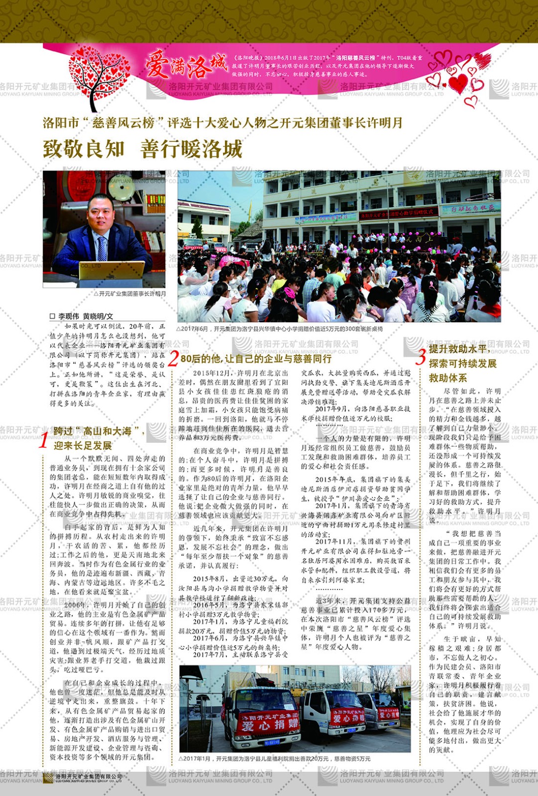 洛陽開元礦業(yè)集團(tuán)有限公司簡介洛陽開元礦業(yè)集團(tuán)有限公司,始成立于2006年,位于洛陽市開元大道269號(hào)。集團(tuán)旗下共有十余家全資子公司,業(yè)務(wù)涉及有色金屬礦山開發(fā)、礦產(chǎn)品購銷與進(jìn)出口貿(mào)易、房地產(chǎn)開發(fā)、文化藝術(shù)、企業(yè)管理與咨詢、資本投資等多個(gè)領(lǐng)域。2024年,集團(tuán)公司銷售總額達(dá)7.8億元。民建河南省委委員、民建河南省委企業(yè)委副主任、民建洛陽市委委員、企業(yè)委主任、洛陽民建企業(yè)家協(xié)會(huì)會(huì)長許明月是公司創(chuàng)始人,現(xiàn)任洛陽開元礦業(yè)集團(tuán)有限公司董事長。在礦業(yè)領(lǐng)域,洛陽開元礦業(yè)集團(tuán)擁有多家實(shí)力雄厚的子公司:貴州開元礦業(yè)有限公司探、采礦權(quán)面積共11.33平方公里;興??h銅鑫礦業(yè)有限公司探礦權(quán)面積8.76平方公里,礦山資源潛力巨大;2021年,開元集團(tuán)與盧氏中科礦業(yè)有限公司開展戰(zhàn)略合作。盧氏中科礦業(yè)有限公司專注于有色金屬的浮選、加工和銷售,擁有強(qiáng)大的技術(shù)支撐平臺(tái),是集探、采、選、冶、研為一體的中大型綜合礦業(yè)企業(yè)。目前,盧氏中科王家河1000噸選礦廠已成功投產(chǎn),雙河金礦、柳關(guān)欒盧鉛鋅礦相繼順利開工,樓房銀礦與圪老灣鉛鋅礦的深部探礦重大突破,標(biāo)志著礦山版圖取得重大進(jìn)展,為開元集團(tuán)后續(xù)發(fā)展奠定了堅(jiān)實(shí)基礎(chǔ)。在文化傳媒領(lǐng)域,洛陽市明月美術(shù)館通過豐富多樣的藝術(shù)展覽、學(xué)術(shù)研討和公共教育活動(dòng),努力打造一個(gè)集展覽、交流、教育、研究為一體的綜合性藝術(shù)平臺(tái)。此外,在金融投資領(lǐng)域,開元集團(tuán)旗下的北京明峰資本管理有限公司專注于投資具有高增長潛力的優(yōu)秀企業(yè),特別是高科技、新能源、環(huán)保等新興產(chǎn)業(yè),為客戶提供個(gè)性化的資產(chǎn)配置服務(wù)。在做好企業(yè)經(jīng)營的同時(shí),開元集團(tuán)始終不忘企業(yè)的社會(huì)責(zé)任和家國情懷,以突出的愛心公益事跡,開展了一系列公益慈善活動(dòng):“民建林”公益事業(yè)通過“思源基金”“幫幫公益”線上公益平臺(tái),與眾多愛心人士籌措資金20余萬元;資助541名貧困大學(xué)生共計(jì)270余萬元,推進(jìn)“數(shù)字助力——河南AI人才培養(yǎng)”;捐款10萬元,馳援京津冀、黑龍江洪水地質(zhì)災(zāi)害……公司于2017年底被洛陽市慈善總會(huì)評為“洛陽慈善風(fēng)云榜——十大愛心集體”。洛陽開元礦業(yè)集團(tuán)有限公司秉承持續(xù)發(fā)展理念,憑借多年來良好的企業(yè)信譽(yù)與經(jīng)營業(yè)績,與全國多家企業(yè)建立了良好合作關(guān)系,受到社會(huì)各界的一致好評,多次榮獲“納稅標(biāo)兵”“先進(jìn)企業(yè)”“招商引資模范企業(yè)”等榮譽(yù)稱號(hào)?;赝麃頃r(shí)路,開元人勠力同心,以“闖”的精神和“創(chuàng)”的勁頭,一路披荊斬棘,踏過千山萬水;展望新未來,開元人凝心聚力,不執(zhí)于“舊”,無畏于“新”,秉承“勇于跨越,追求卓越”的企業(yè)精神,乘著國家高質(zhì)量發(fā)展新征程的東風(fēng),跨過高山,越過大海,向著集團(tuán)多元化、國際化的目標(biāo),逐夢遠(yuǎn)航,跨越前行!