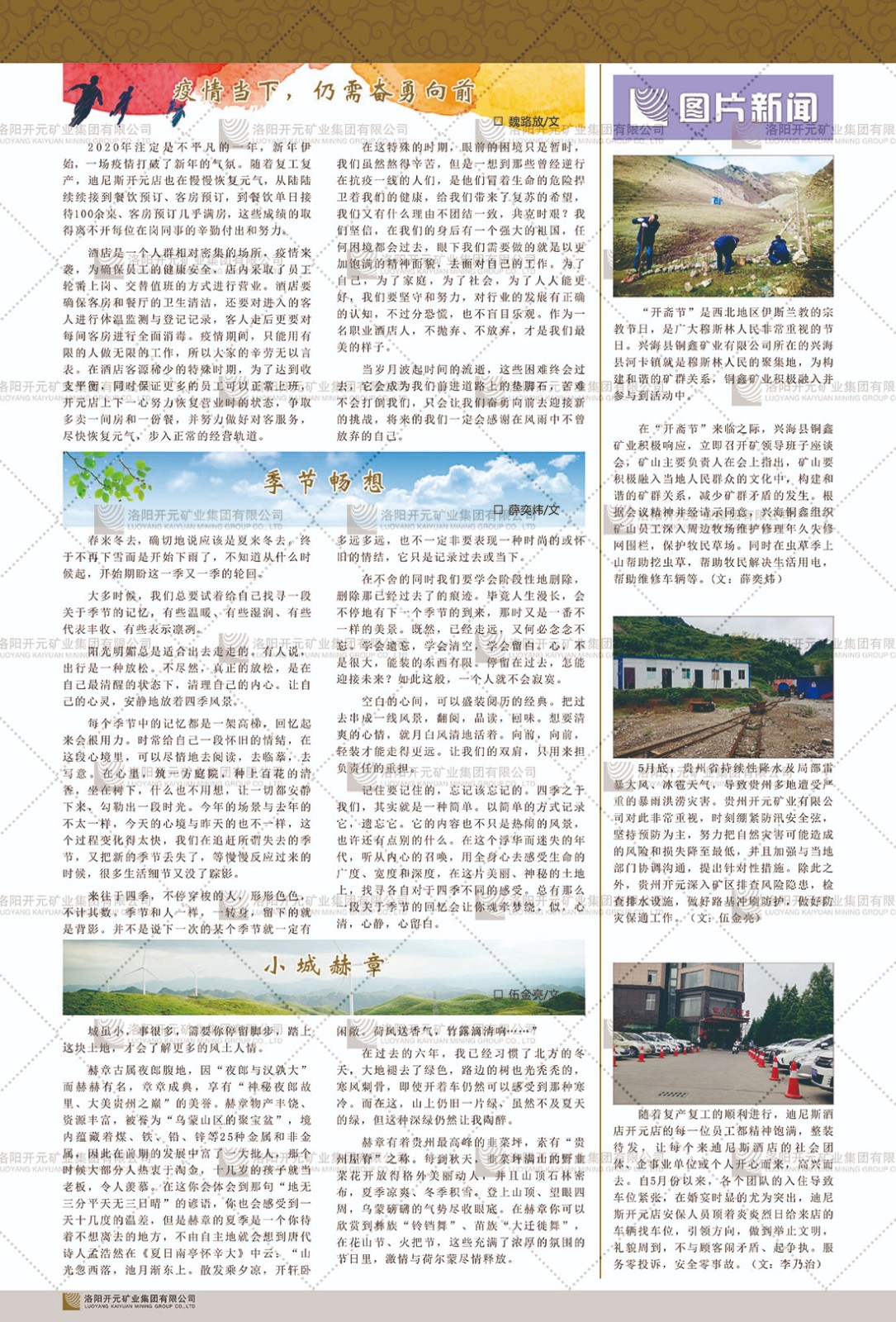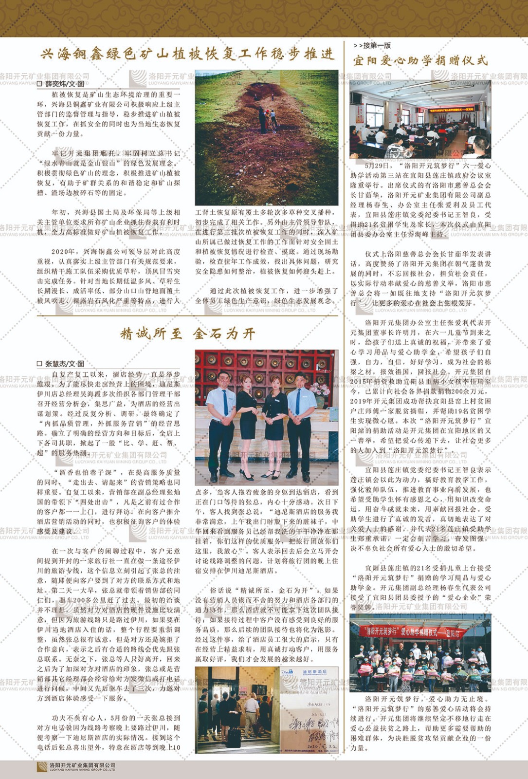 洛陽開元礦業(yè)集團有限公司簡介洛陽開元礦業(yè)集團有限公司,始成立于2006年,位于洛陽市開元大道269號。集團旗下共有十余家全資子公司,業(yè)務(wù)涉及有色金屬礦山開發(fā)、礦產(chǎn)品購銷與進出口貿(mào)易、房地產(chǎn)開發(fā)、文化藝術(shù)、企業(yè)管理與咨詢、資本投資等多個領(lǐng)域。2024年,集團公司銷售總額達7.8億元。民建河南省委委員、民建河南省委企業(yè)委副主任、民建洛陽市委委員、企業(yè)委主任、洛陽民建企業(yè)家協(xié)會會長許明月是公司創(chuàng)始人,現(xiàn)任洛陽開元礦業(yè)集團有限公司董事長。在礦業(yè)領(lǐng)域,洛陽開元礦業(yè)集團擁有多家實力雄厚的子公司:貴州開元礦業(yè)有限公司探、采礦權(quán)面積共11.33平方公里;興海縣銅鑫礦業(yè)有限公司探礦權(quán)面積8.76平方公里,礦山資源潛力巨大;2021年,開元集團與盧氏中科礦業(yè)有限公司開展戰(zhàn)略合作。盧氏中科礦業(yè)有限公司專注于有色金屬的浮選、加工和銷售,擁有強大的技術(shù)支撐平臺,是集探、采、選、冶、研為一體的中大型綜合礦業(yè)企業(yè)。目前,盧氏中科王家河1000噸選礦廠已成功投產(chǎn),雙河金礦、柳關(guān)欒盧鉛鋅礦相繼順利開工,樓房銀礦與圪老灣鉛鋅礦的深部探礦重大突破,標志著礦山版圖取得重大進展,為開元集團后續(xù)發(fā)展奠定了堅實基礎(chǔ)。在文化傳媒領(lǐng)域,洛陽市明月美術(shù)館通過豐富多樣的藝術(shù)展覽、學(xué)術(shù)研討和公共教育活動,努力打造一個集展覽、交流、教育、研究為一體的綜合性藝術(shù)平臺。此外,在金融投資領(lǐng)域,開元集團旗下的北京明峰資本管理有限公司專注于投資具有高增長潛力的優(yōu)秀企業(yè),特別是高科技、新能源、環(huán)保等新興產(chǎn)業(yè),為客戶提供個性化的資產(chǎn)配置服務(wù)。在做好企業(yè)經(jīng)營的同時,開元集團始終不忘企業(yè)的社會責(zé)任和家國情懷,以突出的愛心公益事跡,開展了一系列公益慈善活動:“民建林”公益事業(yè)通過“思源基金”“幫幫公益”線上公益平臺,與眾多愛心人士籌措資金20余萬元;資助541名貧困大學(xué)生共計270余萬元,推進“數(shù)字助力——河南AI人才培養(yǎng)”;捐款10萬元,馳援京津冀、黑龍江洪水地質(zhì)災(zāi)害……公司于2017年底被洛陽市慈善總會評為“洛陽慈善風(fēng)云榜——十大愛心集體”。洛陽開元礦業(yè)集團有限公司秉承持續(xù)發(fā)展理念,憑借多年來良好的企業(yè)信譽與經(jīng)營業(yè)績,與全國多家企業(yè)建立了良好合作關(guān)系,受到社會各界的一致好評,多次榮獲“納稅標兵”“先進企業(yè)”“招商引資模范企業(yè)”等榮譽稱號?;赝麃頃r路,開元人勠力同心,以“闖”的精神和“創(chuàng)”的勁頭,一路披荊斬棘,踏過千山萬水;展望新未來,開元人凝心聚力,不執(zhí)于“舊”,無畏于“新”,秉承“勇于跨越,追求卓越”的企業(yè)精神,乘著國家高質(zhì)量發(fā)展新征程的東風(fēng),跨過高山,越過大海,向著集團多元化、國際化的目標,逐夢遠航,跨越前行!