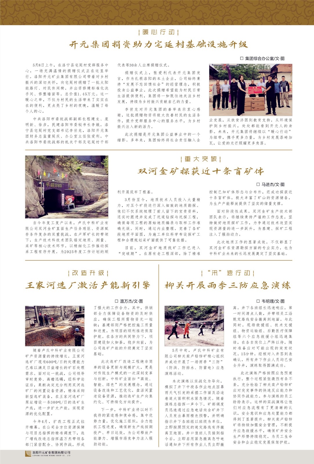 洛陽開元礦業(yè)集團有限公司簡介洛陽開元礦業(yè)集團有限公司,始成立于2006年,位于洛陽市開元大道269號。集團旗下共有十余家全資子公司,業(yè)務涉及有色金屬礦山開發(fā)、礦產(chǎn)品購銷與進出口貿(mào)易、房地產(chǎn)開發(fā)、文化藝術、企業(yè)管理與咨詢、資本投資等多個領域。2024年,集團公司銷售總額達7.8億元。民建河南省委委員、民建河南省委企業(yè)委副主任、民建洛陽市委委員、企業(yè)委主任、洛陽民建企業(yè)家協(xié)會會長許明月是公司創(chuàng)始人,現(xiàn)任洛陽開元礦業(yè)集團有限公司董事長。在礦業(yè)領域,洛陽開元礦業(yè)集團擁有多家實力雄厚的子公司:貴州開元礦業(yè)有限公司探、采礦權面積共11.33平方公里;興??h銅鑫礦業(yè)有限公司探礦權面積8.76平方公里,礦山資源潛力巨大;2021年,開元集團與盧氏中科礦業(yè)有限公司開展戰(zhàn)略合作。盧氏中科礦業(yè)有限公司專注于有色金屬的浮選、加工和銷售,擁有強大的技術支撐平臺,是集探、采、選、冶、研為一體的中大型綜合礦業(yè)企業(yè)。目前,盧氏中科王家河1000噸選礦廠已成功投產(chǎn),雙河金礦、柳關欒盧鉛鋅礦相繼順利開工,樓房銀礦與圪老灣鉛鋅礦的深部探礦重大突破,標志著礦山版圖取得重大進展,為開元集團后續(xù)發(fā)展奠定了堅實基礎。在文化傳媒領域,洛陽市明月美術館通過豐富多樣的藝術展覽、學術研討和公共教育活動,努力打造一個集展覽、交流、教育、研究為一體的綜合性藝術平臺。此外,在金融投資領域,開元集團旗下的北京明峰資本管理有限公司專注于投資具有高增長潛力的優(yōu)秀企業(yè),特別是高科技、新能源、環(huán)保等新興產(chǎn)業(yè),為客戶提供個性化的資產(chǎn)配置服務。在做好企業(yè)經(jīng)營的同時,開元集團始終不忘企業(yè)的社會責任和家國情懷,以突出的愛心公益事跡,開展了一系列公益慈善活動:“民建林”公益事業(yè)通過“思源基金”“幫幫公益”線上公益平臺,與眾多愛心人士籌措資金20余萬元;資助541名貧困大學生共計270余萬元,推進“數(shù)字助力——河南AI人才培養(yǎng)”;捐款10萬元,馳援京津冀、黑龍江洪水地質(zhì)災害……公司于2017年底被洛陽市慈善總會評為“洛陽慈善風云榜——十大愛心集體”。洛陽開元礦業(yè)集團有限公司秉承持續(xù)發(fā)展理念,憑借多年來良好的企業(yè)信譽與經(jīng)營業(yè)績,與全國多家企業(yè)建立了良好合作關系,受到社會各界的一致好評,多次榮獲“納稅標兵”“先進企業(yè)”“招商引資模范企業(yè)”等榮譽稱號?;赝麃頃r路,開元人勠力同心,以“闖”的精神和“創(chuàng)”的勁頭,一路披荊斬棘,踏過千山萬水;展望新未來,開元人凝心聚力,不執(zhí)于“舊”,無畏于“新”,秉承“勇于跨越,追求卓越”的企業(yè)精神,乘著國家高質(zhì)量發(fā)展新征程的東風,跨過高山,越過大海,向著集團多元化、國際化的目標,逐夢遠航,跨越前行!
